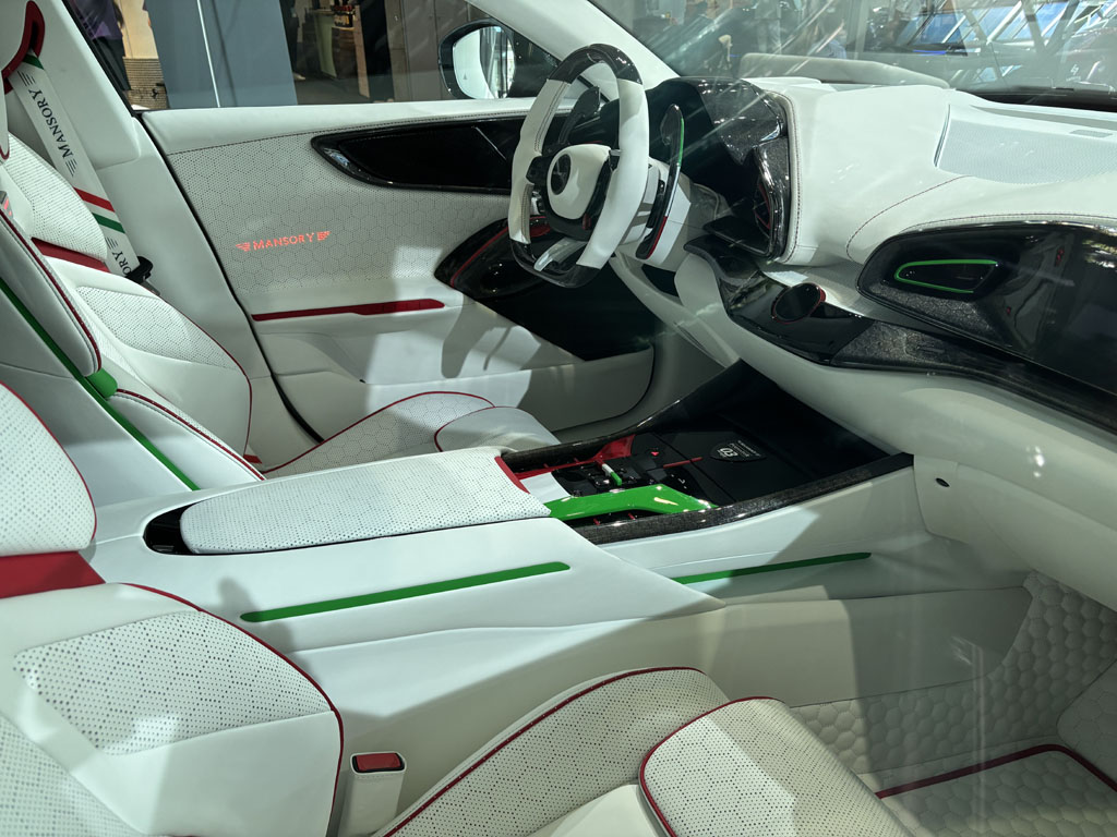 Sur cette vue on peut dénombrer au moins 10 logos Mansory (appuie-têtes, écussons, étriers de freins, poignées de portes, rétros, jantes …) ! Si tu ne sais pas que c’est une Mansory, tu es aveugle. Un des vendeurs m’a-t-il confié que en option tu peux aussi te faire tatouer Mansory sur le front ? Non, j’ai du rêver.