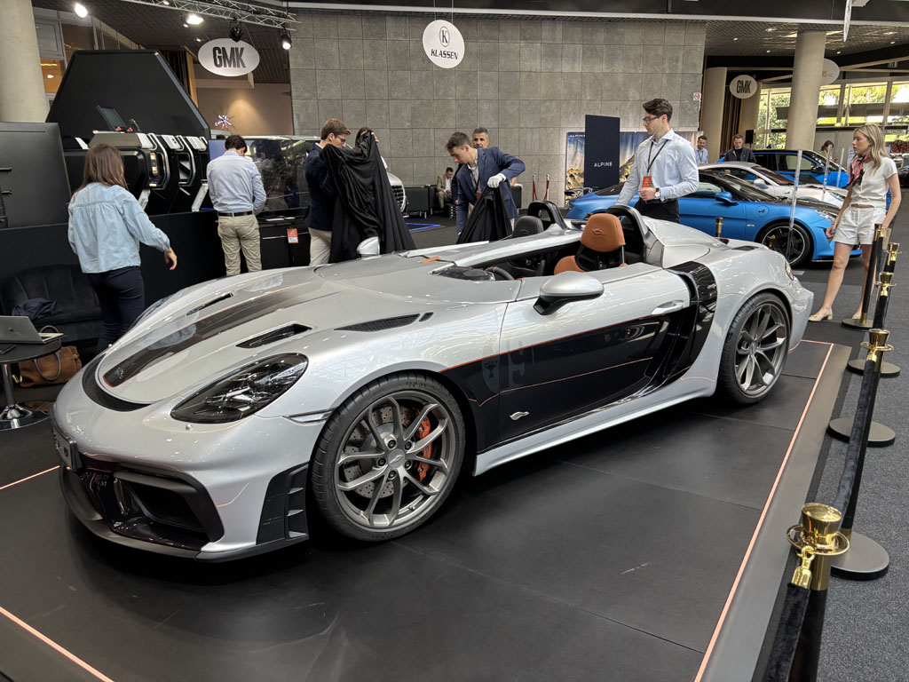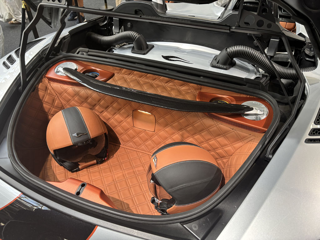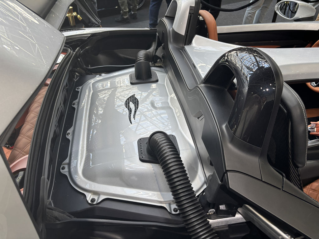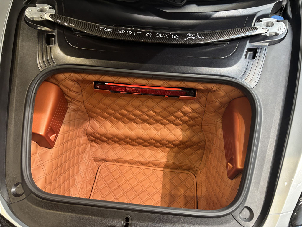 C’était l’une des voitures les plus intéressantes du salon, en première mondiale. Ce roadster 2 places est basé sur une Porsche Boxster ou Cayman et propulsé par le même moteur. On y retrouve la même architecture à moteur central avec un profond coffre avant, un coffre arrière assez grand renfermant les servitudes huile et eau et une barre carbone de rigidification entre attaches d’amortisseurs. Le moteur est ici beaucoup plus accessible.