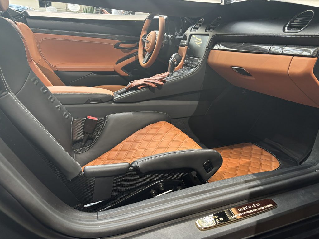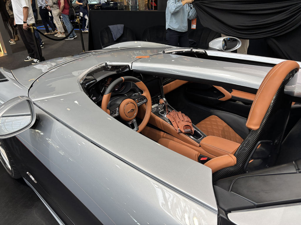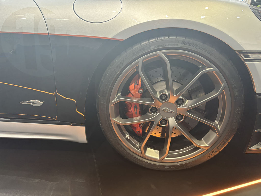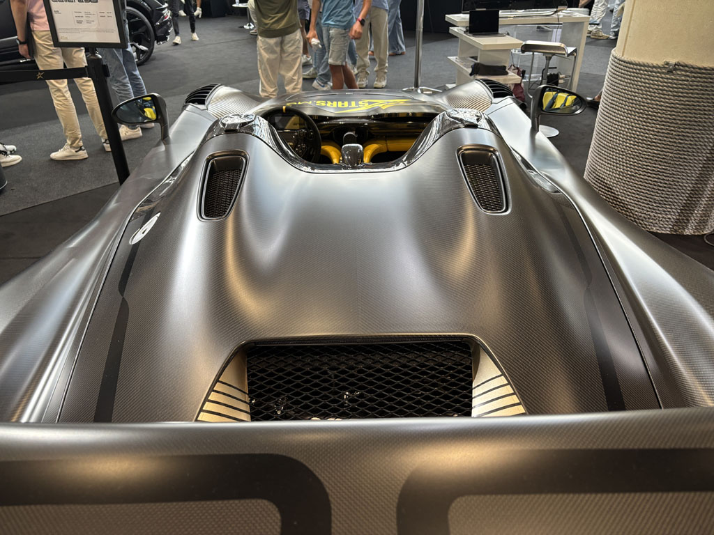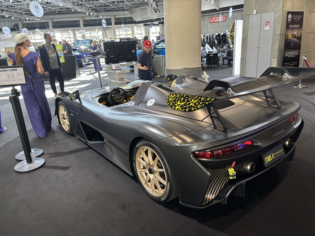 C’était l’une des voitures les plus intéressantes du salon, en première mondiale. Ce roadster 2 places est basé sur une Porsche Boxster ou Cayman et propulsé par le même moteur. On y retrouve la même architecture à moteur central avec un profond coffre avant, un coffre arrière assez grand renfermant les servitudes huile et eau et une barre carbone de rigidification entre attaches d’amortisseurs. Le moteur est ici beaucoup plus accessible.