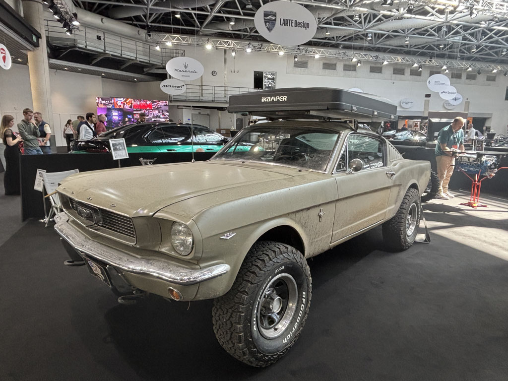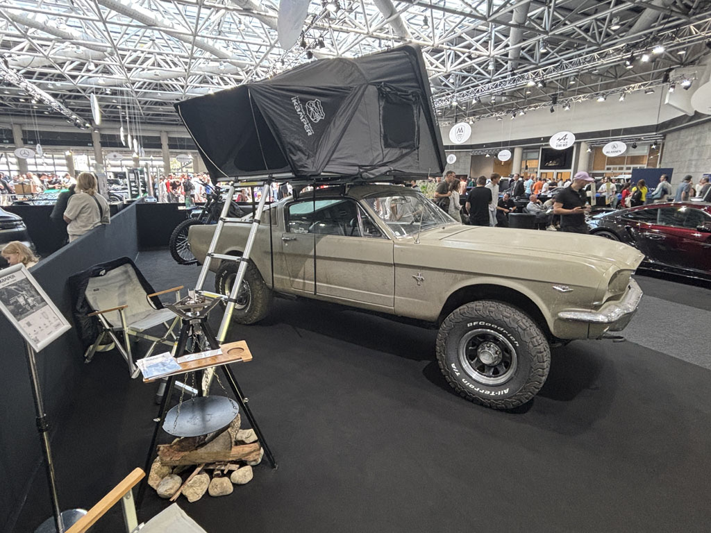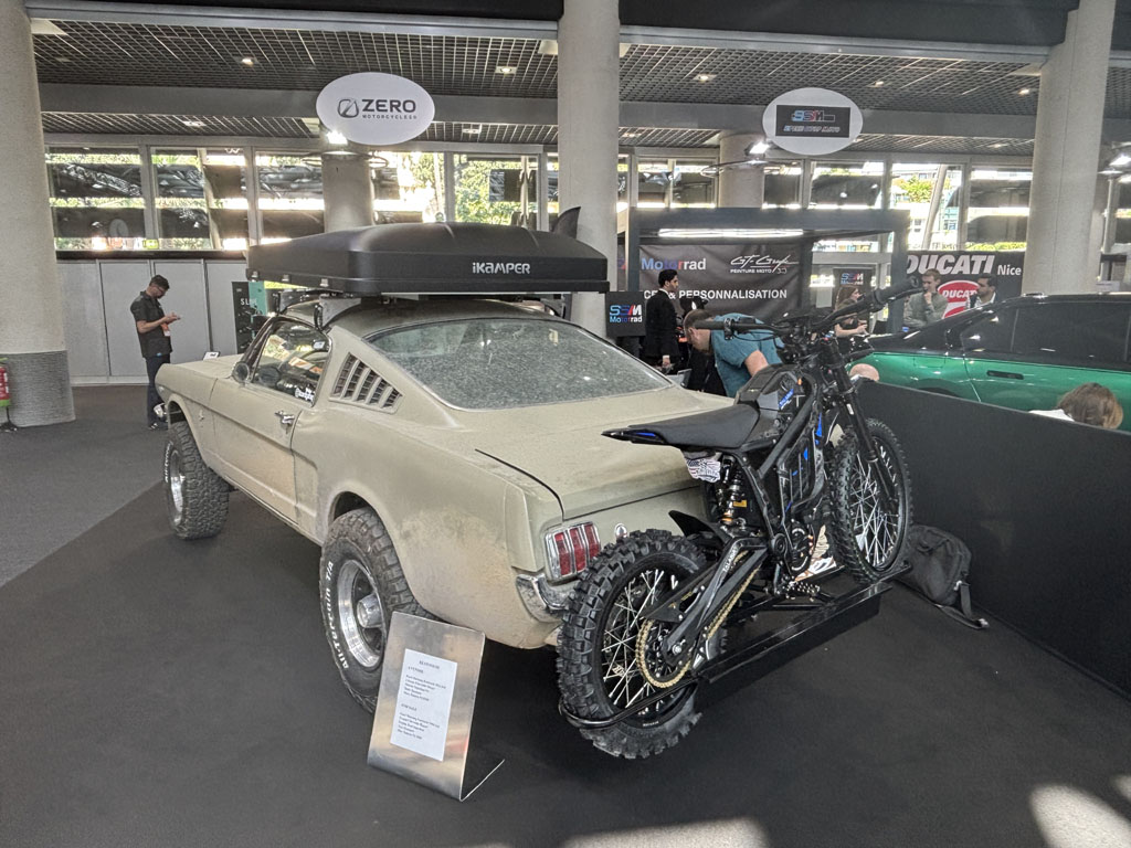 Restomod toujours, voici pour les explorateurs ou aventuriers une Ford Mustang Fastback 1966 4X4, montée sur un chassis de Chevrolet Blazer avec un moteur V6. La moto à l’arrière est une Talaria TL5500 électrique et la tente sur le toit est fournie par Ikamper … Le tout présenté par Lizard Garage.