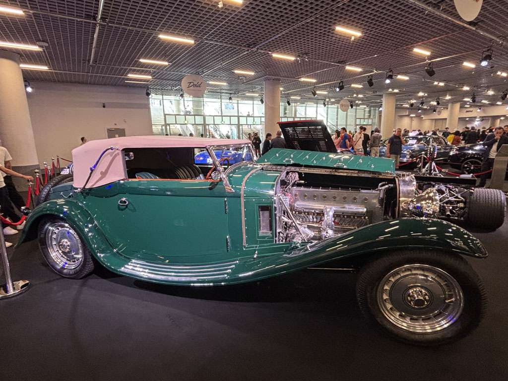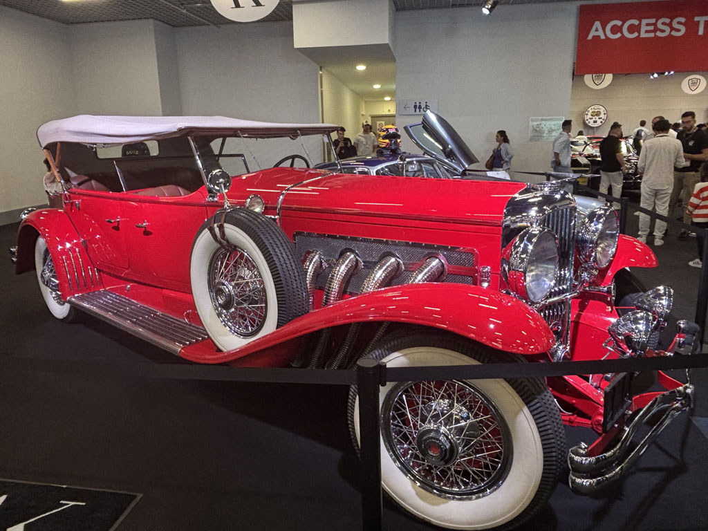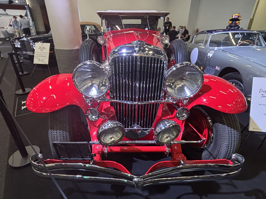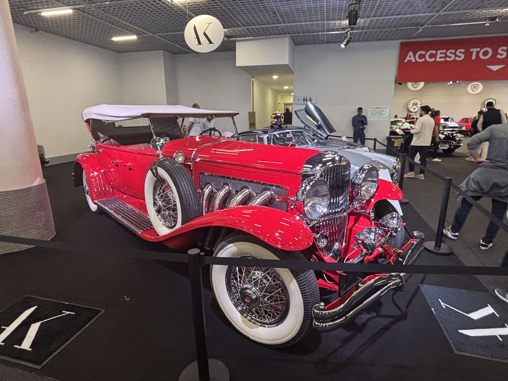 À noter la monumentale Duesenberg 1930 à phares orientables par une biellette couplée à la direction.